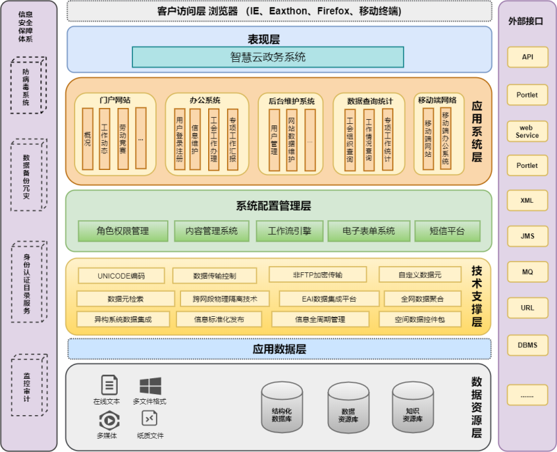 本項目旨在通過集成云計算、移動互聯、大數據等新興技術,迎合目前電子政務系統(tǒng)向精細化、智能化、社會化的智慧云政務系統(tǒng)發(fā)展的趨勢,解決傳統(tǒng)電子政務系統(tǒng)較難實現的跨界業(yè)務協同(全景業(yè)務模式)、異構平臺數據訪問、多維度智能表單等關鍵技術,實現云端政務子系統(tǒng)、內容管理子系統(tǒng)、工作流平臺、多維度智能表單系統(tǒng)、跨平臺數據訪問中間件、基于元數據的動態(tài)指標庫、基于ArcGIS的GIS數據調用中間件等功能模塊,主要由公眾平臺、政務平臺、決策平臺三大平臺組成,形成支持智慧政府協作的新一代智慧云政務系統(tǒng)。主要內容如下: